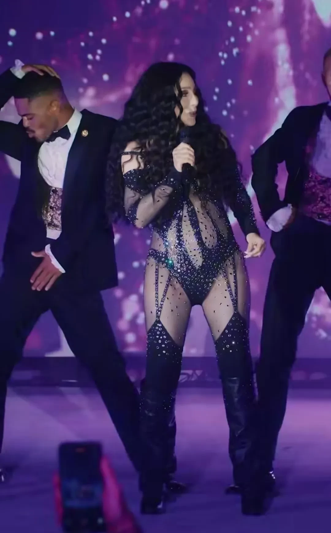 Китти СпенсерХедлайнером вечеринки была 79-летняя Шер. Она исполнила свои главные хиты, представ за время выступления в двух разных образах.