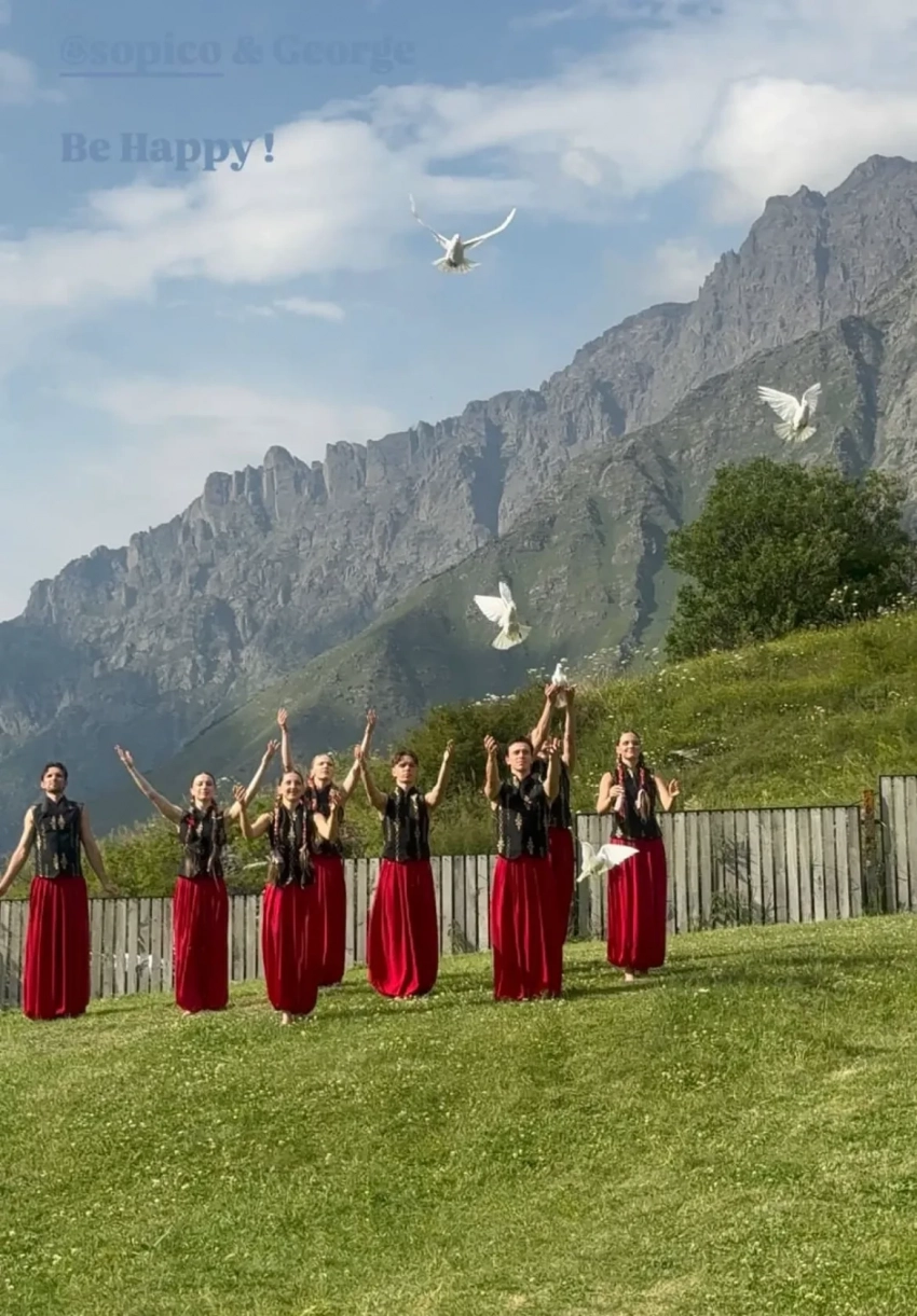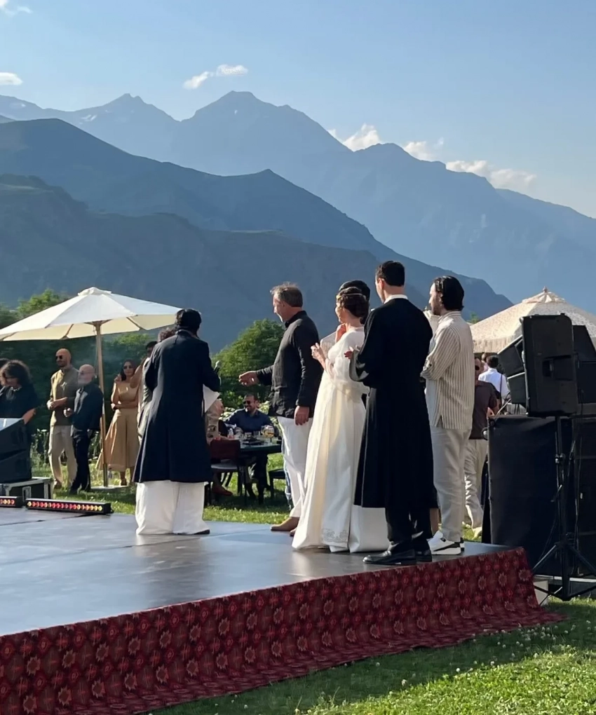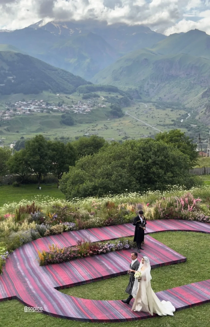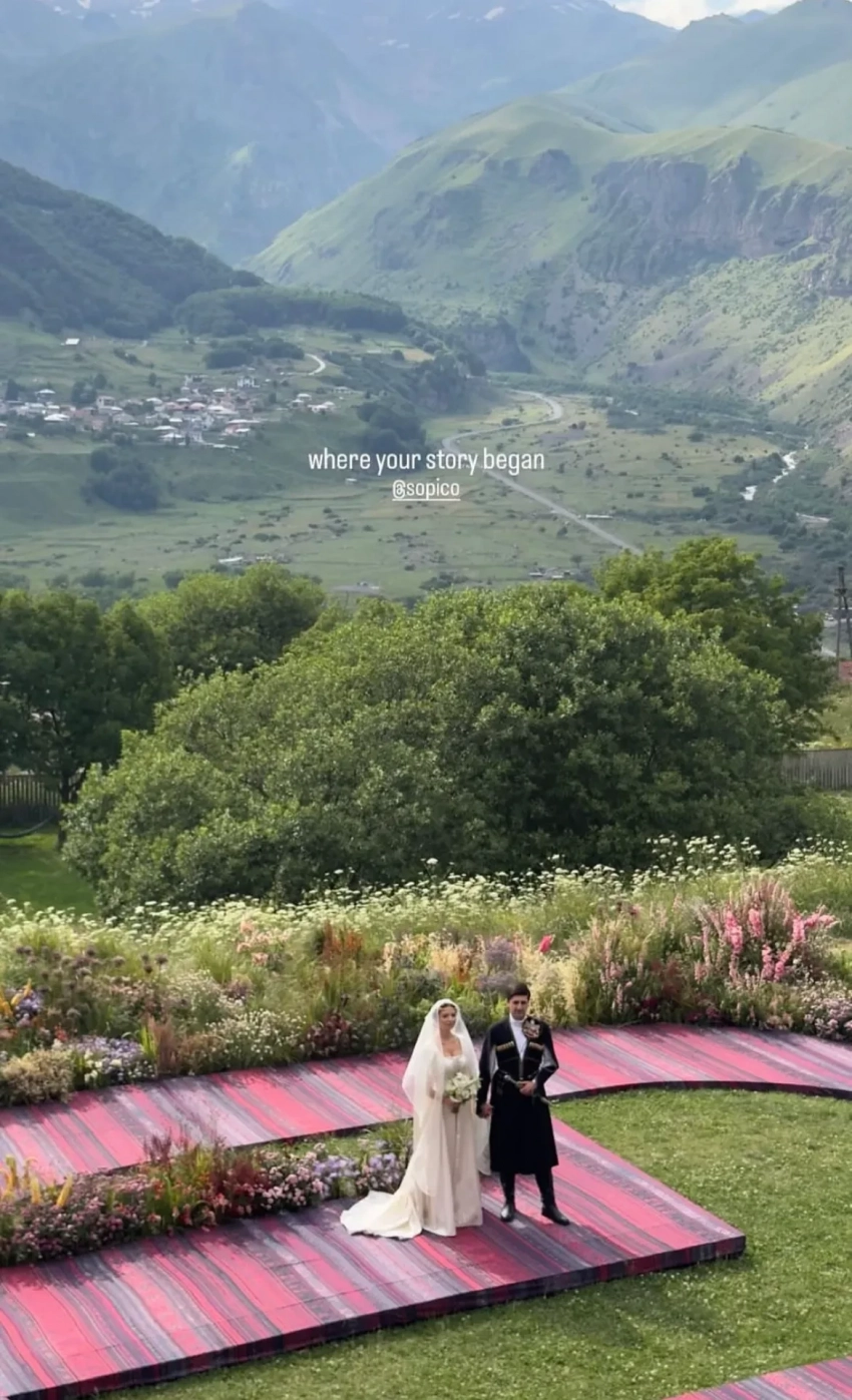 Традиционную грузинскую свадьбу отгуляли в отеле Rooms Kazbegi в Степанцминде, у подножья горы Казбек. Многочисленные родственники и друзья пары нарядились в национальные костюмы, наслаждались выступлениями местных артистов и народными танцами в исполнении жениха и невесты.