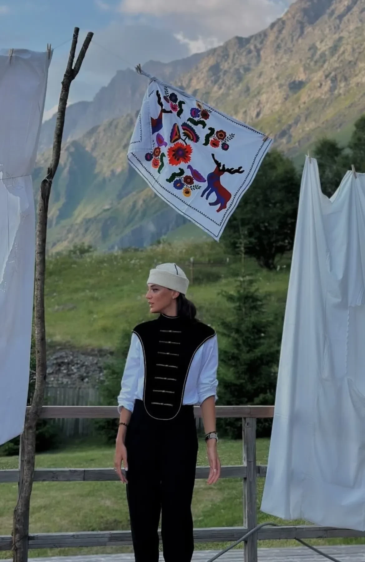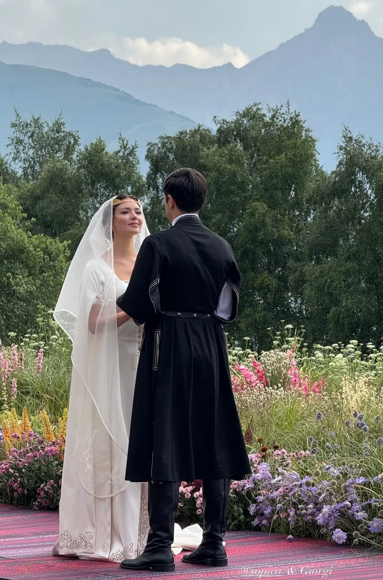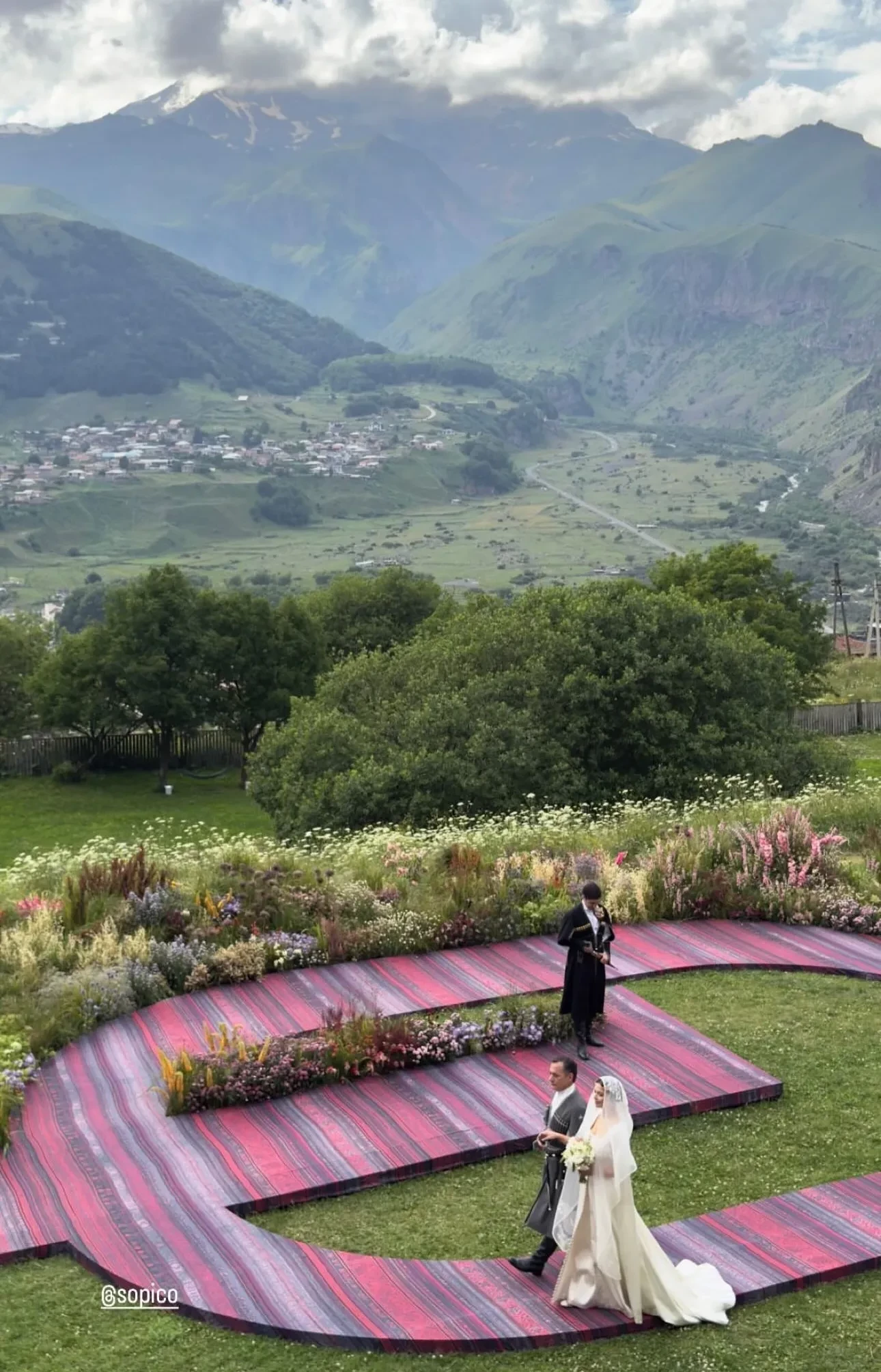 Традиционную грузинскую свадьбу отгуляли в отеле Rooms Kazbegi в Степанцминде, у подножья горы Казбек. Многочисленные родственники и друзья пары нарядились в национальные костюмы, наслаждались выступлениями местных артистов и народными танцами в исполнении жениха и невесты.