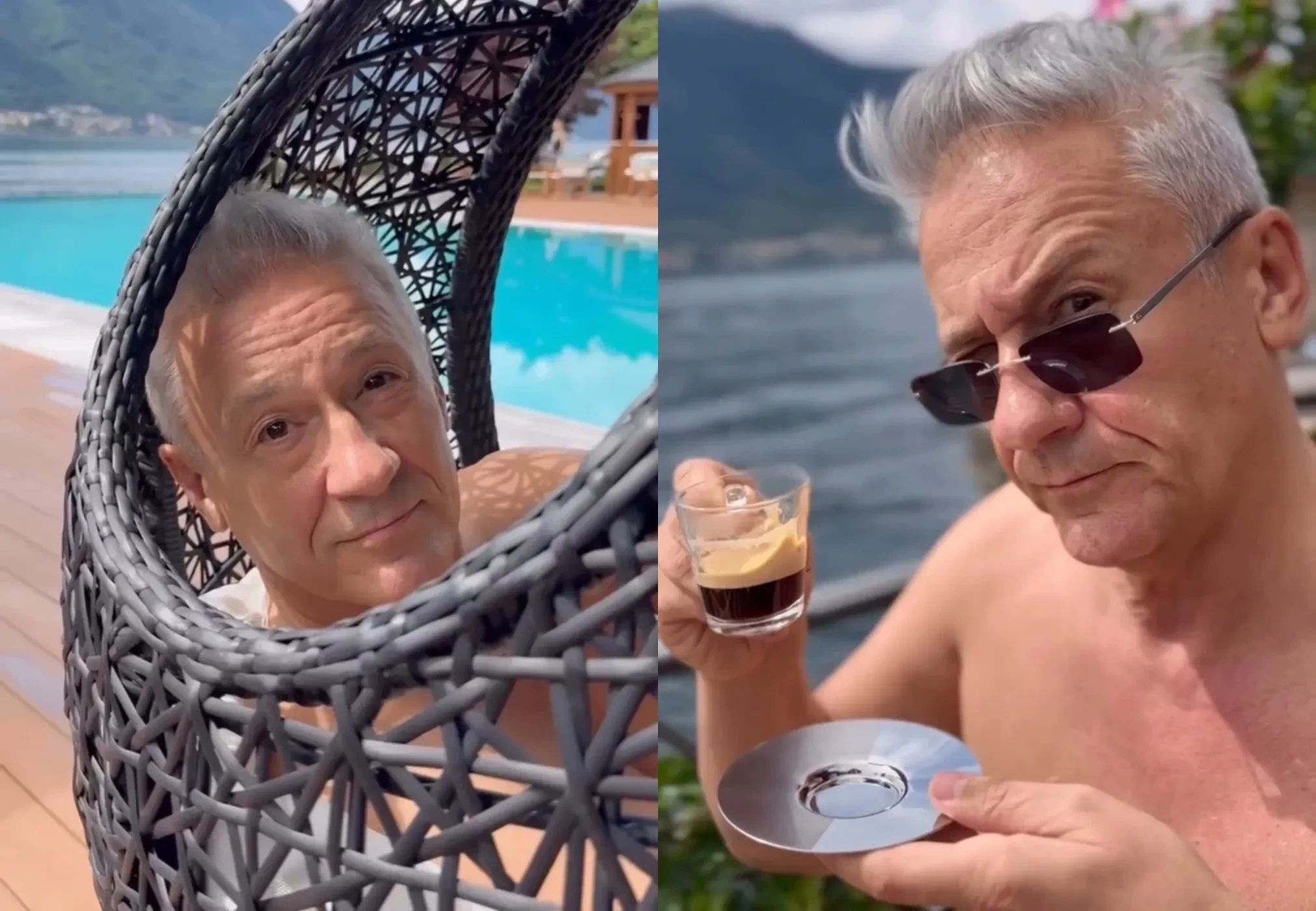 Под хит Тото Кутуньо Меньшиков продемонстрировал свои летние будни: он плавает в бассейне и знаменитом озере Комо, читает книги, наслаждается местным эспрессо и любуется видами.