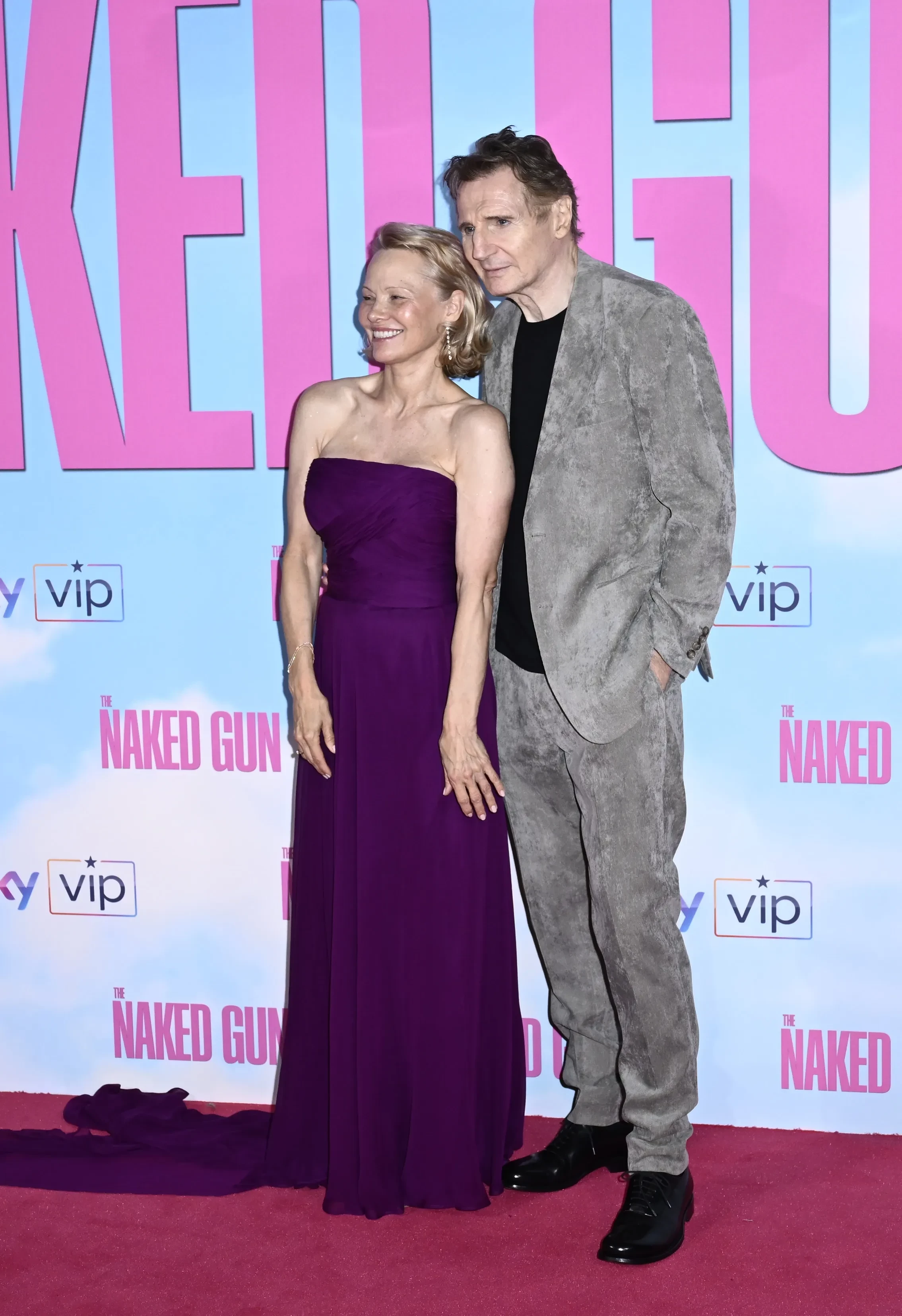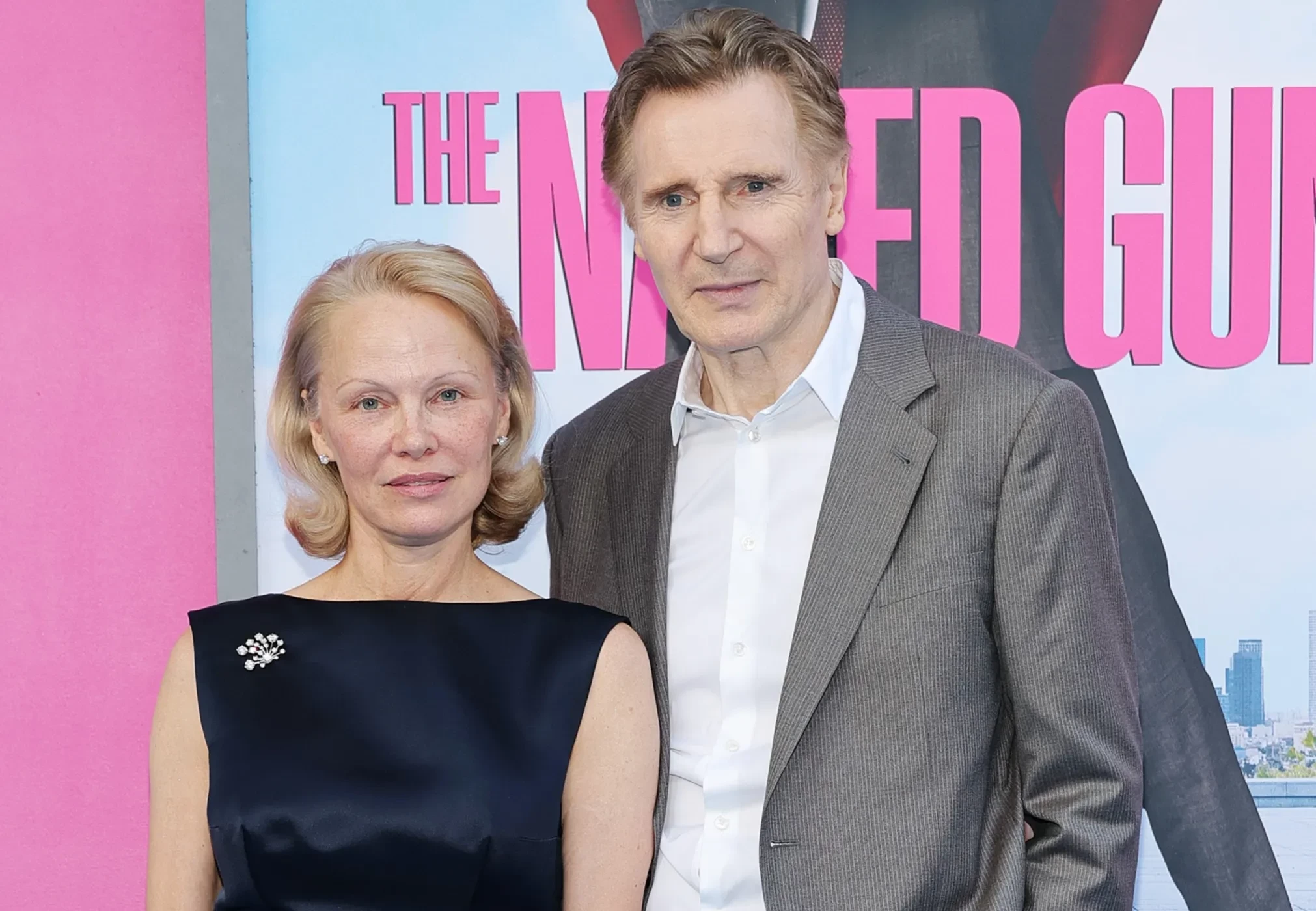 Лиам Нисон и Памела Андерсон на постере фильма "Голый пистолет"Памела Андерсон была замужем пять раз, два из которых за Риком Саломоном. У неё двое взрослых сыновей от первого мужа, Томми Ли. У Нисона также двое взрослых сыновей от покойной супруги Наташи Ричардсон. Она умерла в 2009 году, и после этого актёр больше не женился.