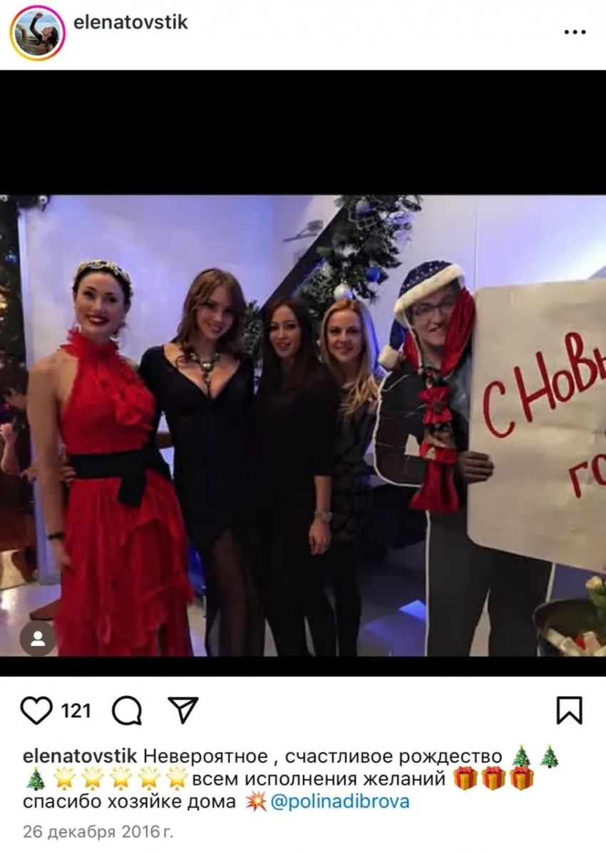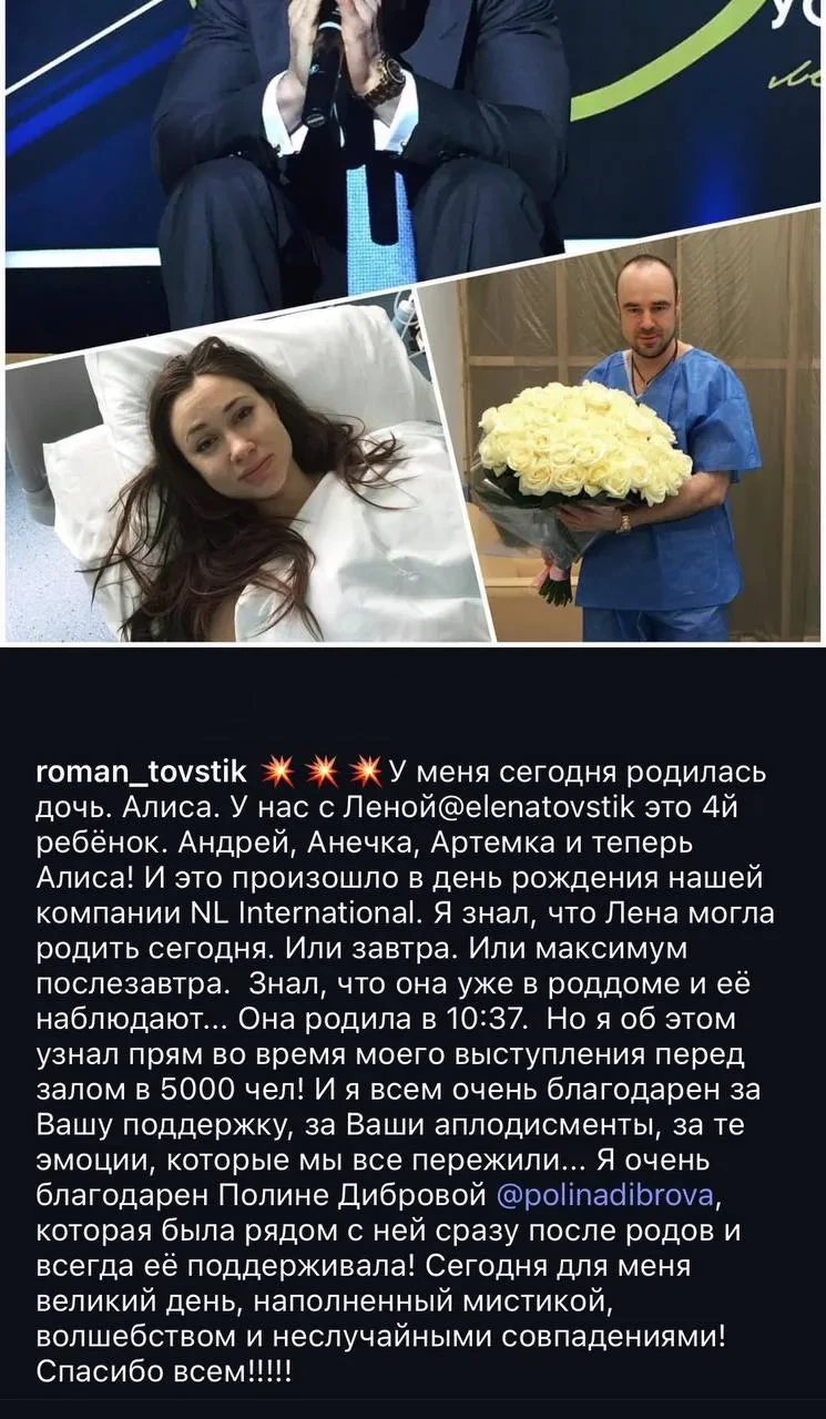 Пост Елены ТовстикПосле этих откровений Елены в сети стали появляться различные подробности о происходящем, и поползла сплетня, что мужа из семьи "увела" близкая подруга Елены — Полина Диброва. Якобы 36-летняя Полина уже давно встречалась с Романом Товстиком, который на 15 лет старше неё, но при этом на 15 лет младше её мужа, 65-летнего телеведущего Дмитрия Диброва. При этом семья Дибровых близко дружила с семьёй Товстик: Полина даже встречала жену своего "любовника" из роддома и присутствовала на крестинах. Елена Товстик также состояла в женском клубе Полины и часто принималась участие в его мероприятиях — в сети можно найти множество совместных фото Полины и Елены. Несмотря на воспитание шестерых детей, Елена Товстик вообще вела активную социальную жизнь: участвовала в соревнованиях по плаванию и соревнованиях по триатлону IronMan, занималась велоспортом и танцами, снималась для обложек журналов.