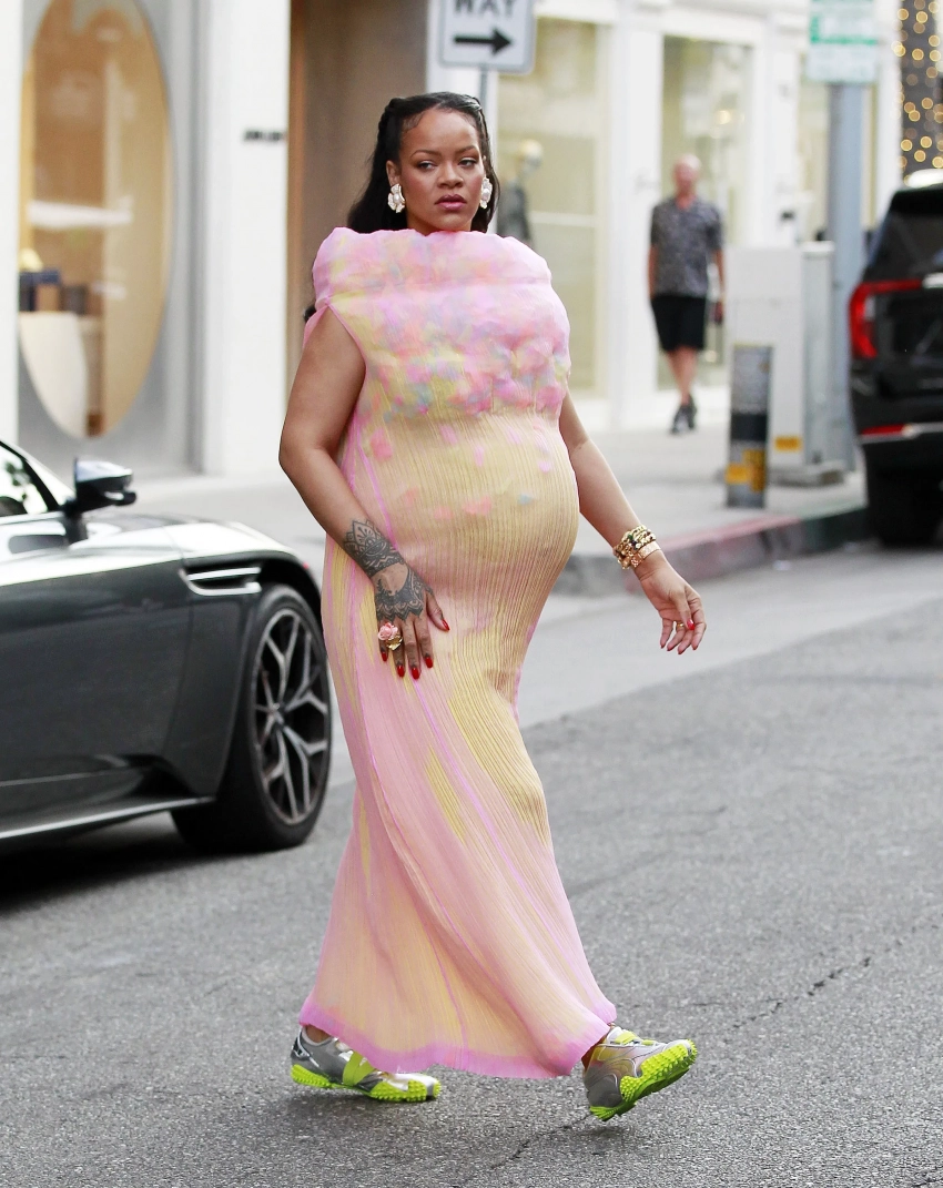 Беременная третьим ребёнком Рианна появилась на публике в новом модном образе. 37-летняя певица попала в объективы папарацци в Лос-Анджелесе, когда прогуливалась по улице в винтажном платье Issey Miyake из летней коллекции 2001 года, напоминающем сахарную вату (хотя, возможно, цветом платья певица намекает, что у неё будет девочка?). Звезда дополнила образ кроссовками Puma x Ottolinger в серебристо-зелёных оттенках и массивными серьгами.