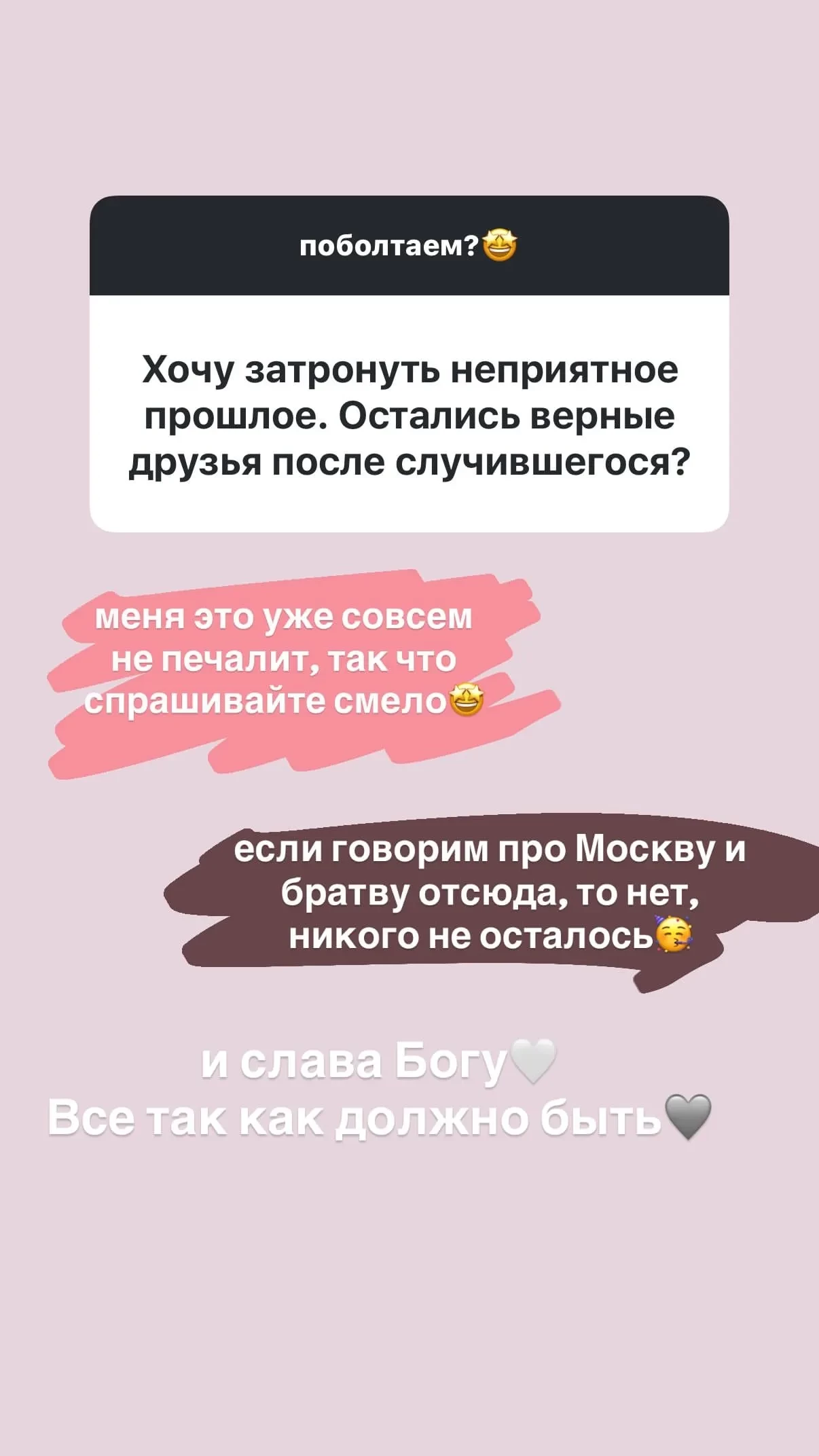 "Если говорить про Москву и братву отсюда, то нет, никого не осталось. И слава богу. Всё так, как должно быть", — написала 34-летняя Ивлеева в своём инстаграме*, добавив, что произошедшее (то есть весь скандал с вечеринкой) её уже не печалит.