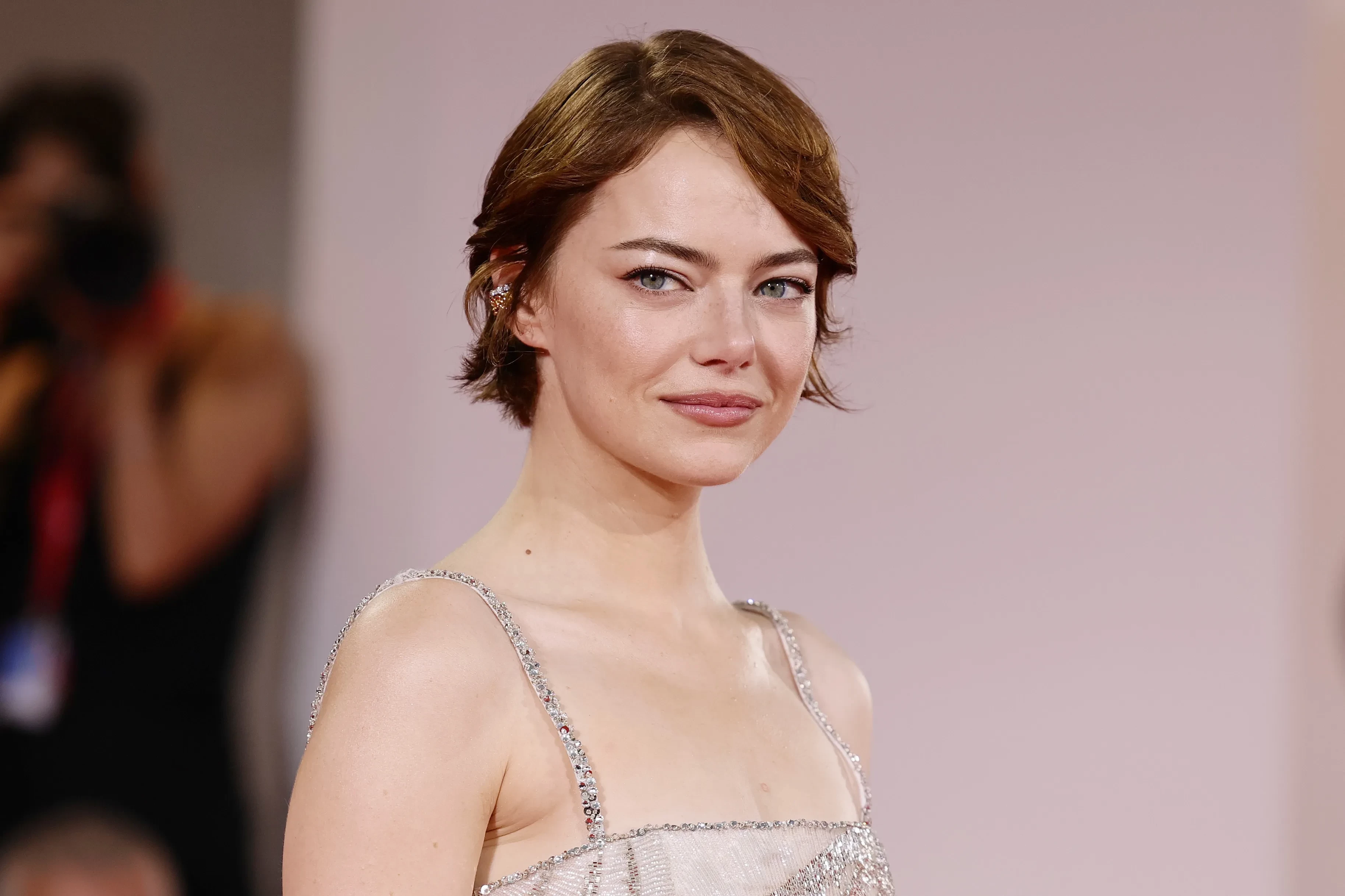 36-летняя Эмма Стоун появилась на дорожке в белом платье с пайетками от Louis Vuitton.