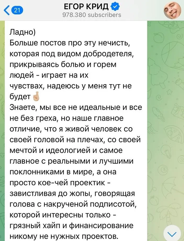 Скриншот из телеграм-канала Егора Крида