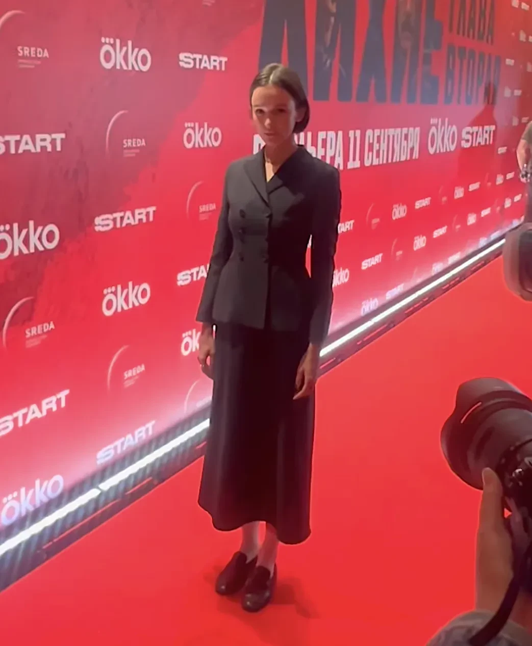 36-летняя актриса и бывшая жена Фёдора Бондарчука позировала на дорожке в чёрном приталенном жакете, юбке-миди и лоферах.