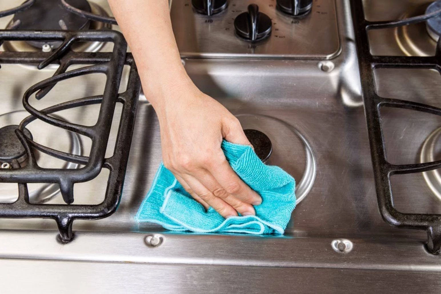 Решётки газовой плиты замочите в тёплой мыльной воде, а в это время займитесь основной поверхностью. Смочите мягкую ткань в приготовленном растворе, тщательно протрите плиту, затем накройте ею загрязнённые участки на 10 минут. Лимонная кислота в составе эффективно растворяет даже старые пятна. После этого удалите остатки средства и протрите плиту насухо.
