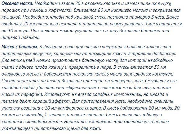 - Неумение подобрать средства по уходу за кожей шеи. Они отличаются от обычных кремов для лица своим составом и функциями. При этом крем нельзя втирать, а лишь наносить массажными движениями кончиков пальцев с постукиванием;