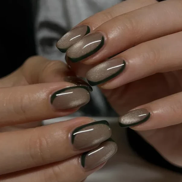 Эффект «кошачий глаз» продолжает быть на пике популярности и способен добавить маникюру загадочности и глубины. Но чтобы сделать его еще более интересным, добавь темно-зеленые лунки на уголках ногтей. Это сочетание темных и светлых оттенков создаст эффект необычного сияния и подчеркнет твой индивидуальный стиль. Маникюр с эффектом «кошачий глаз» идеально подходит для осенне-зимнего периода, привнося в образы немного магии и мистики.