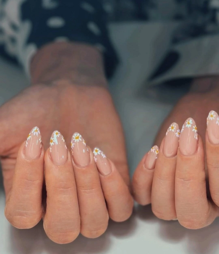 Комбинация нюдового покрытия и миниатюрных ромашек смотрится одновременно элегантно и жизнерадостно. Нюд обеспечивает универсальность и практичность — отросшие ногти выглядят аккуратно, а дизайн не теряет своего вида со временем. Ромашки добавляют легкий флирт и весеннее настроение — словно первые теплые лучи солнца на коже.