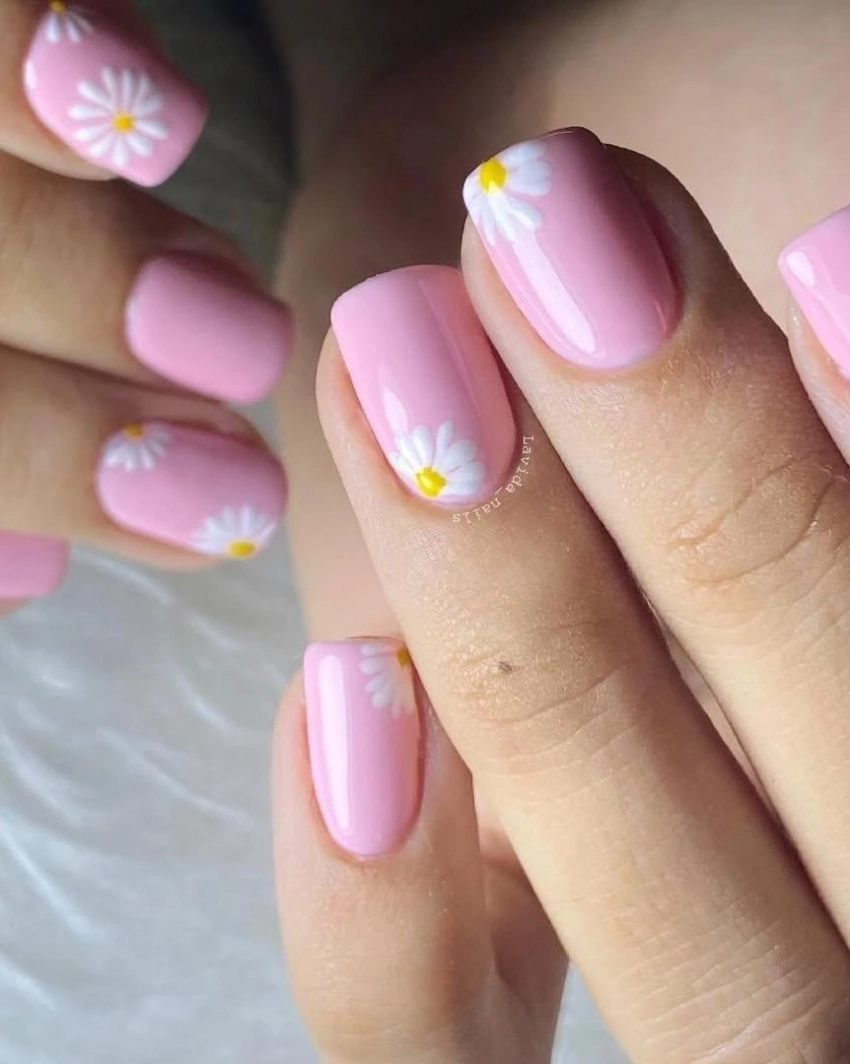 Хотите выделиться? Замените нюд на пастельную основу — голубой, лавандовый, мятный или персиковый. А сами ромашки можно сделать не в классических бело-желтых тонах, а, например, с розовыми лепестками и золотыми сердцевинами.