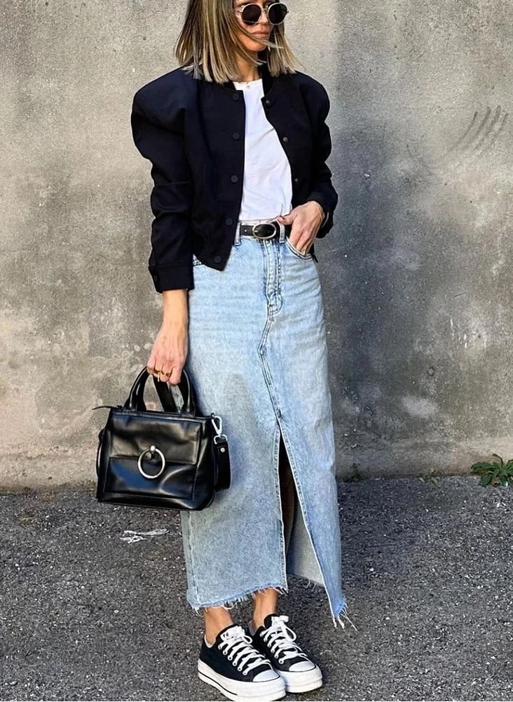 Джинсовая юбка миди с кроп-бомбером — отличный городской образ. Выбирай облегающий топ и дополняй массивными кроссовками или лоферами.