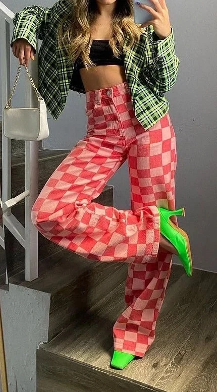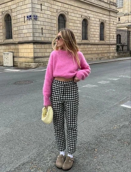 Фуксия с классической чёрно-белой клеткой — это эффектный и запоминающийся образ. Пастельный розовый с цветной клеткой добавит мягкости, а неоновый розовый с клеткой станет вызовом для смелых модниц.