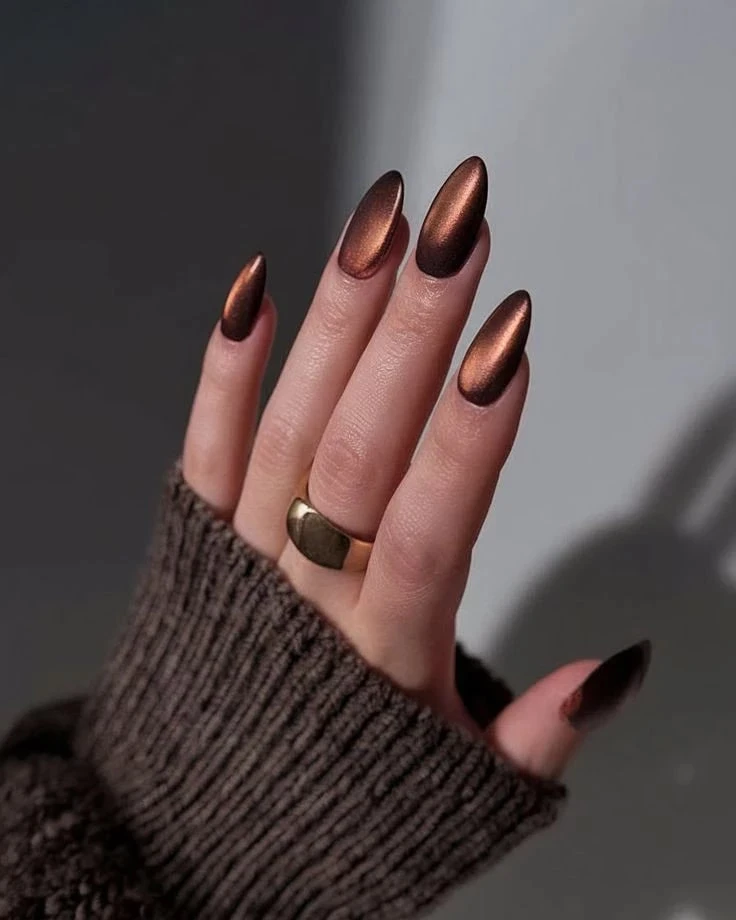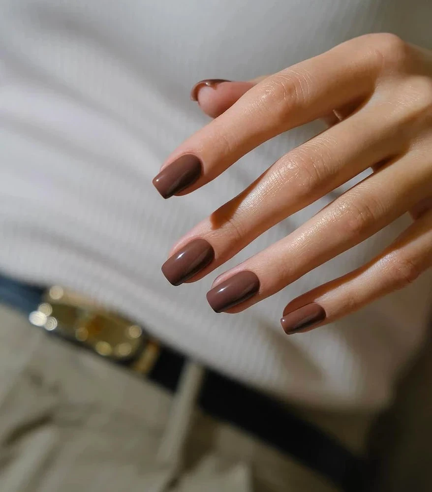 Коричневый в этом сезоне звучит по-новому: мерцающий, глубокий и благородный. Шоколадный шиммер не только добавляет тепла образу, но и смотрится дорого. А еще он невероятно практичен: сколы незаметны, а блеск делает ногти ухоженными.