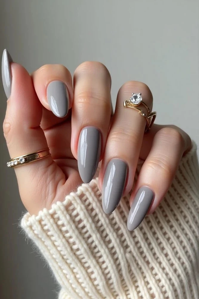 Серая гамма — хит сезона. От жемчужно-светлого до графитового, она звучит многогранно. Интересный прием — сочетание матового и глянцевого финиша: например, матовый фон и блестящие акценты на отдельных ногтях. Такой минимализм выглядит стильно и продуманно.