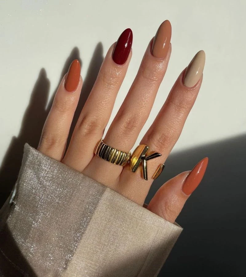 Классика никогда не устареет. Вдохновленный природой дизайн с кленовыми листочками или градиентами в теплой палитре выглядит особенно актуально. Омбре от золотисто-желтого к насыщенному бордовому идеально подходит для коротких ногтей, сочетая в себе практичность и выразительность.