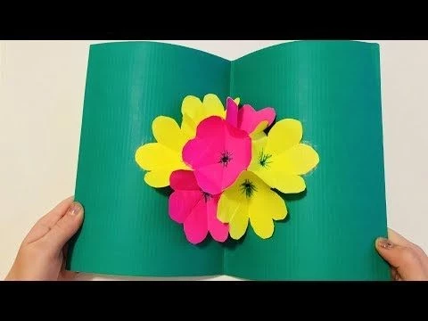 Каждый лист сложите пополам и вырежьте на них заготовки цветов, которые затем склейте в объемный букет. Прикрепите его к цветному картону, оформив открытку. Напишите внутри теплое поздравление.