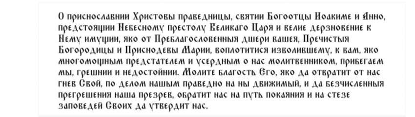 «О, святии праведницы, Богоотцы Иоакиме и Анно! Молите Милосердаго Господа, яко да отвратит от нас гнев Свой, по делом нашим праведно на ны движимый, и да беcчисленные прегрешения наша презрев, обратит нас, рабов Божих, на путь покаяния, и на стези заповедей Своих да утвердит нас.