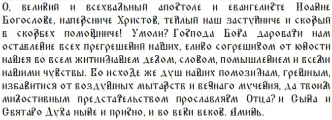 В этот день верующие прибегают к молитвам перед святым апостолом Иоанном Богословом. Они просят о здоровье, взаимопонимании в семье и душевном спокойствии. Семьи, мечтающие о потомстве, умоляют его о даровании счастья материнства. Рыбаки обращаются к нему за поддержкой и удачей в их нелегком труде на море, передает сайт Rsute.ru.