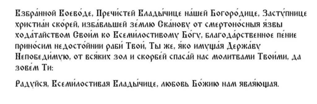 Вруча́ем бо живо́т свой Твоему́ покро́ву и промышле́нию, да ре́вностно всегда́ пое́м Тебе́ со все́ми святы́ми: ра́дуйся, Благода́тная, ра́дуйся, Обра́дованная, ра́дуйся, Преблагослове́нная, ра́дуйся, Препросла́вленная во ве́ки. Ами́нь.