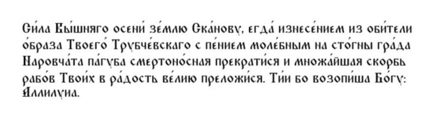 Я́коже не́когда поми́ловала еси́ прибега́вших к покро́ву Твоему́ люде́й земли́ Ска́новей и изба́вила их от смертоно́сныя я́звы, и неизрече́нным Твои́м смотре́нием сохрани́ла еси́ уде́л Свой Трубче́вский. Та́ко и нас всех, с ве́рою моля́щихся Тебе́, изба́ви от паде́ний грехо́вных, от наве́та злых челове́к, от собла́знов ми́ра и искуше́ний, скорбе́й и бед, от смертоно́сныя я́звы и от внеза́пныя и напра́сныя сме́рти.