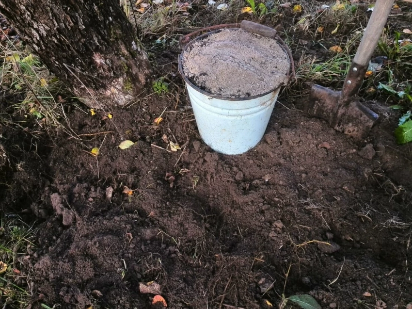 Перегной или компост. Молодым деревьям до 3 лет достаточно 1–2 ведер, взрослым требуется не менее 4. Удобрение равномерно рассыпают в приствольном круге, слегка заделывают в почву граблями и обильно поливают.