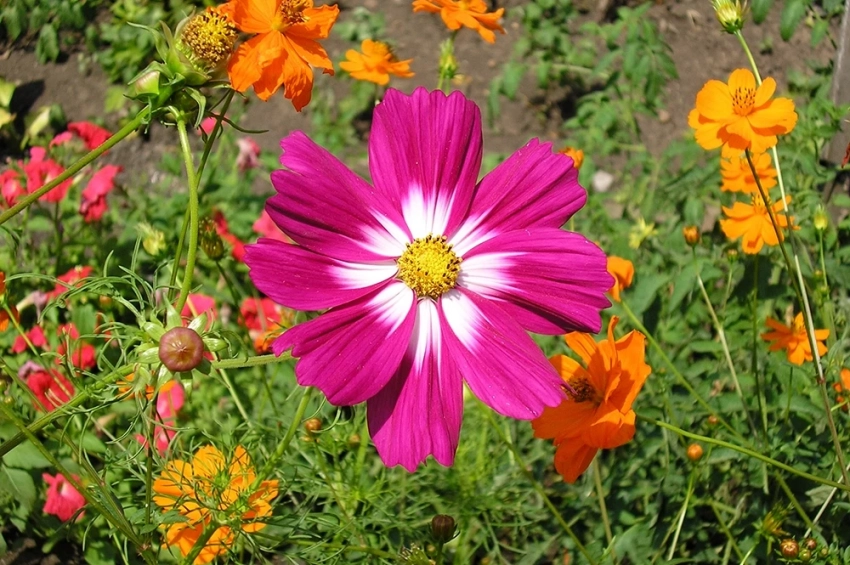 1. Космея — это легкие, воздушные цветы, которые словно созданы для летнего сада. Они не требуют особого ухода, хорошо переносят засуху и быстро всходят, радуя глаз своими яркими цветами уже к середине лета.