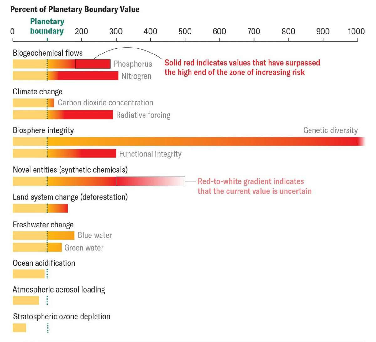По мнению ученых, описанные «красные линии» не являются необратимыми критическими точками, за которыми последует быстрый коллапс. Но они являются пороговыми значениями, за которыми значительно возрастает риск серьезных изменений в физических, биологических и химических системах жизнеобеспечения Земли.